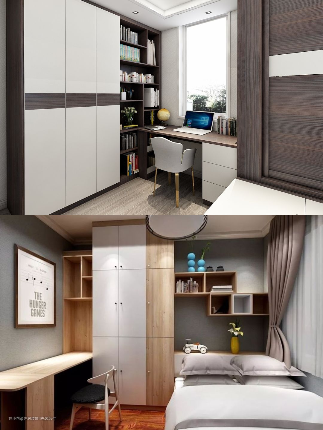 - 衣柜与书桌一体化:可以选择定制衣柜,将书桌与衣柜结合在一起。例如,衣柜的一侧可以设计为书桌,书桌上方可以是书架或储物格,方便放置书籍和杂物。这种设计不仅节省空间,还能使卧室看起来更加整洁。