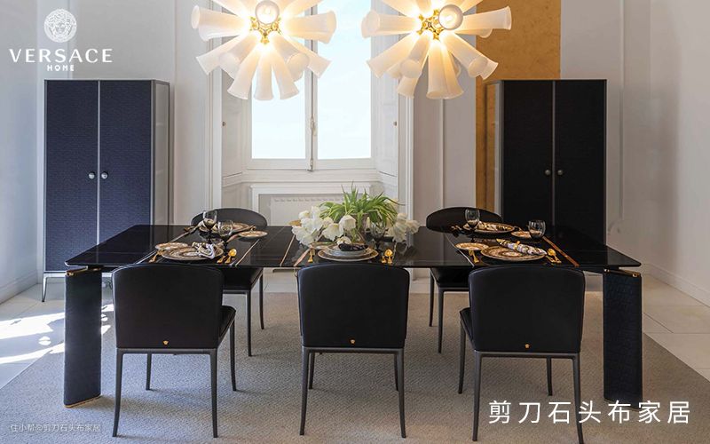 范思哲(Versace)代表着一个品牌家族,一个时尚帝国。其设计风格非常鲜明,独具美感,极具先锋艺术的特点,一直以来都风靡全球!从比弗利山庄到滨江的豪宅,Versace Home的餐厅系列都是许多豪宅的标配。这些餐桌和椅子的造型简洁大气,而亮点则留给了材质。天然大理石的纹理炫丽迷人,点缀着克制的黑、白和金色,既雅致又沉稳。