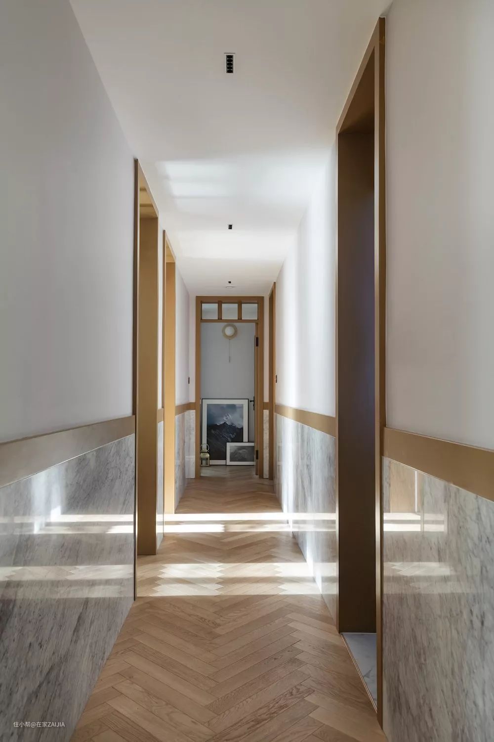 走廊半墙用天然大理石和实木腰线装饰,我记得这个大理石有个好听的名字叫“小天使”。这个空间可能有人觉得是浪费,但这里却是我家两个小天使最喜欢跑来跑去的地方。当早晨的阳光穿过房间洒在走廊上,美好的一天就这样开始了。