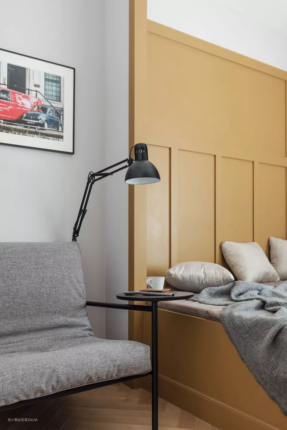 落地灯带一个小小的圆桌,水杯可以放在上面,起一个超mini床头柜的作用。墙板和榻榻米刷的是客厅餐厅同款颜色的油漆。