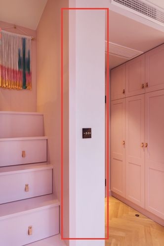 高低床的台阶做成抽屉,可以放杂物或者小件衣服,图中红框里的墙壁另一侧是书柜,书柜对面是大容量衣柜。