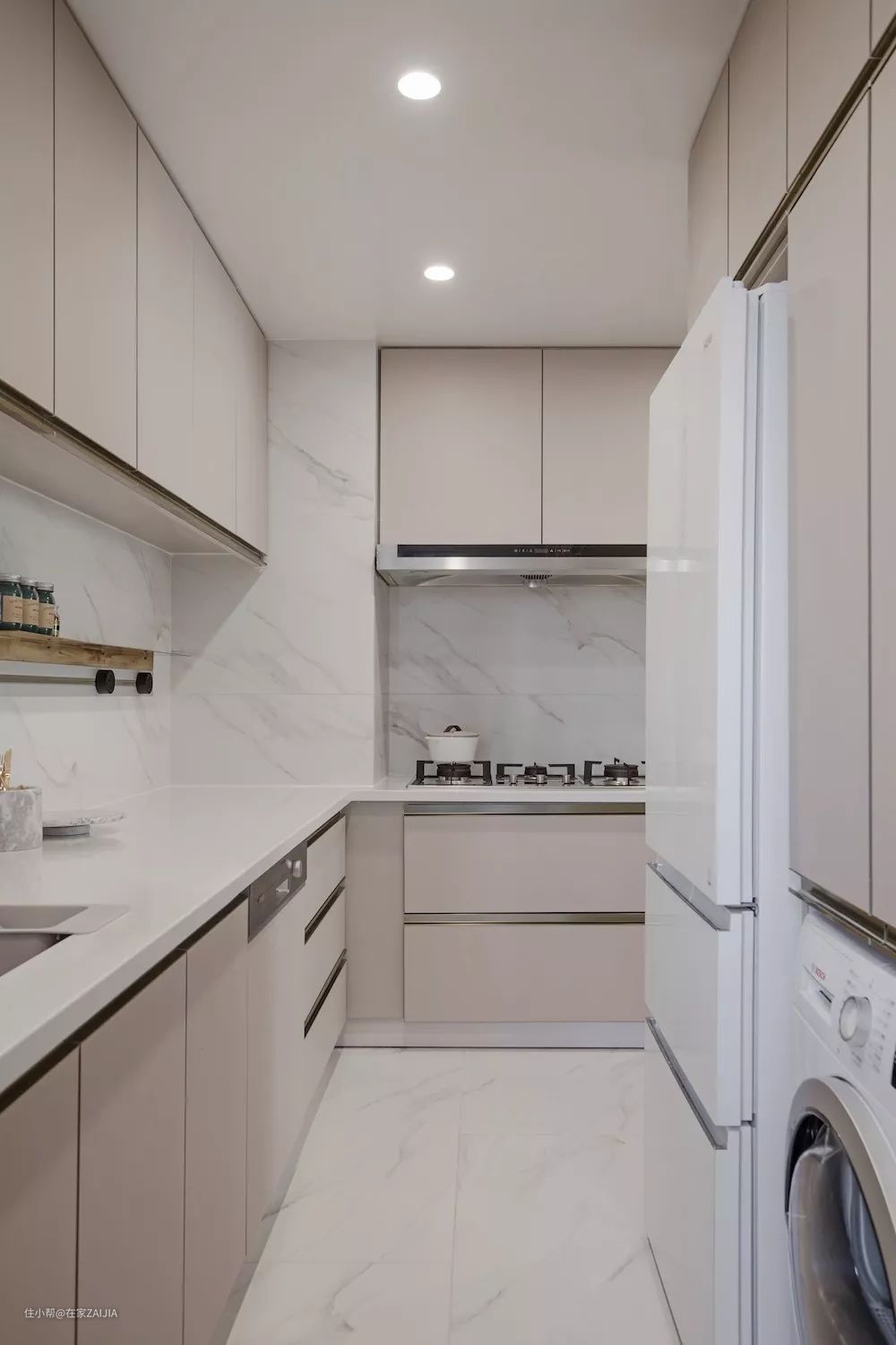 厨房有近8米的橱柜,使用起来很方便,厨房设备和台面电器都有各自固定的区域。同时也设置了许多储物柜,增大收纳空间。