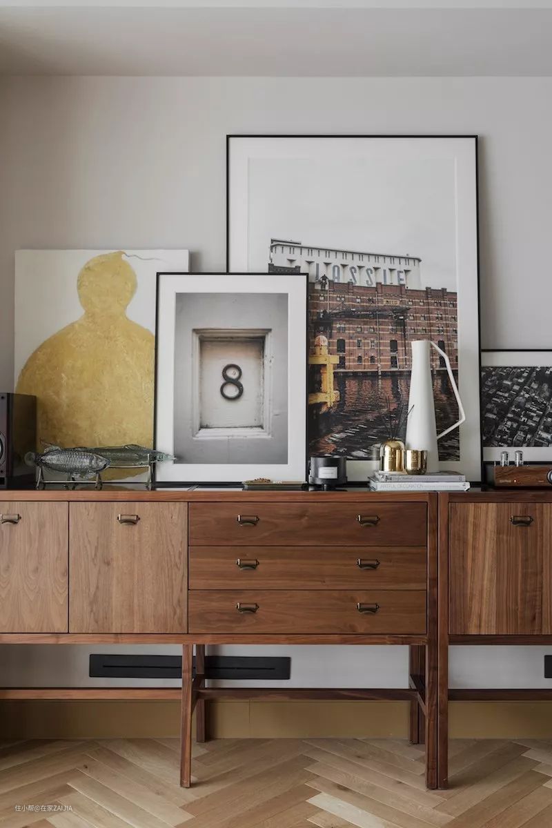 在家的时候,除了睡觉,一家人呆的最多的地方就是客厅。客厅没有放电视,我希望家人在这里能有更多的互动和沟通。两套带有漂亮肌理的实木边柜贴墙放,上面摆放的装饰画都是我自己在旅行中拍摄的,很有纪念意义。