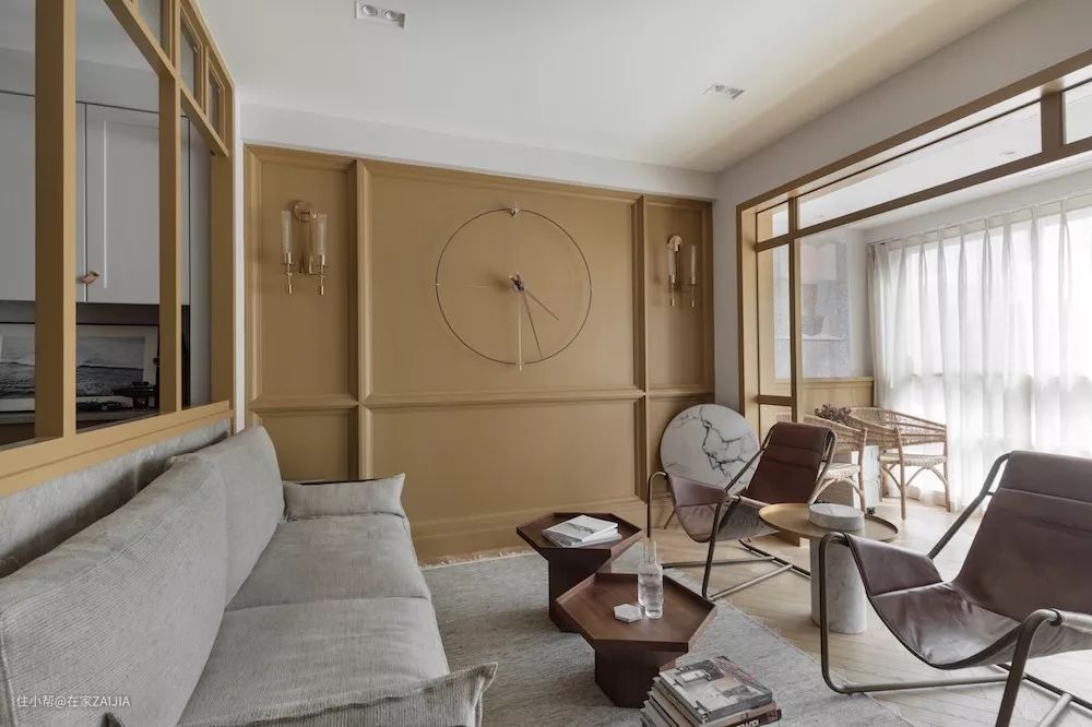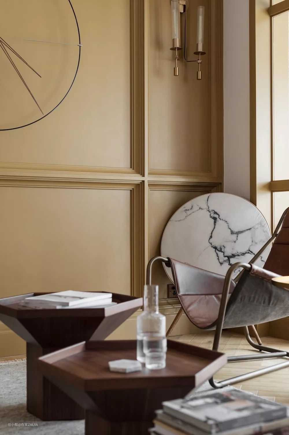 客厅另一侧墙壁用姜黄色实木护墙板,为了保持家里的色彩统一,所以整座房子的门框、踢脚线、墙板都用的同色油漆,这个颜色的灵感来自于沙漠和峡谷中风化的岩石。