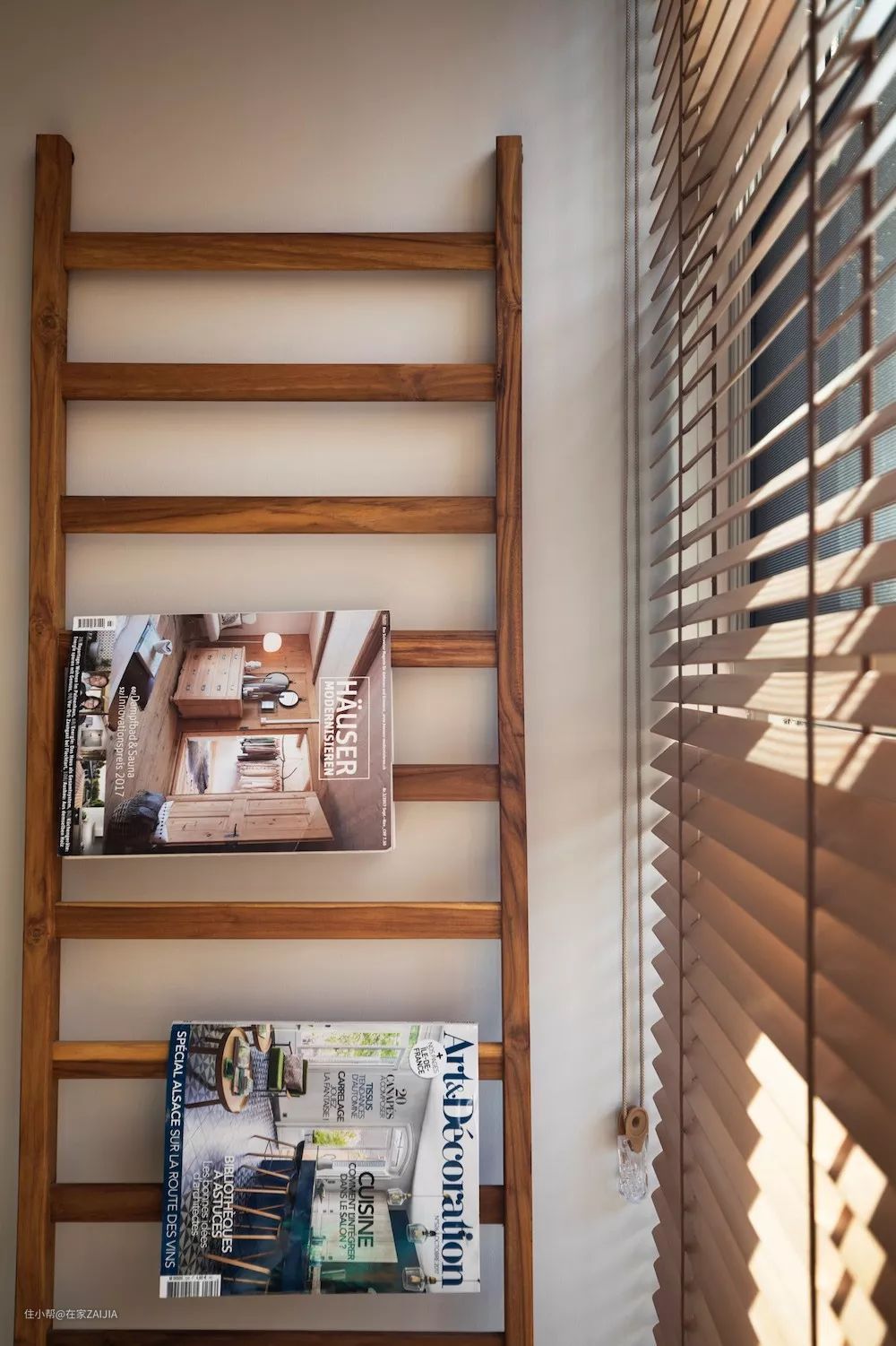 梯子收纳架、百叶窗、床头设计都有线条元素,彼此呼应。除了放杂志,收纳架还可以挂隔夜衣。