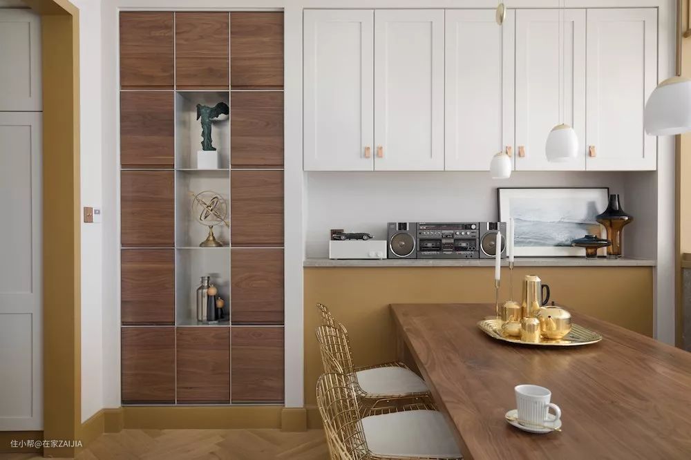 为了让餐厅的收纳设计尽量不占用活动空间,收纳柜都做成了嵌入式。半墙与吊柜中间的壁龛还能摆放收音机、装饰画等物件。