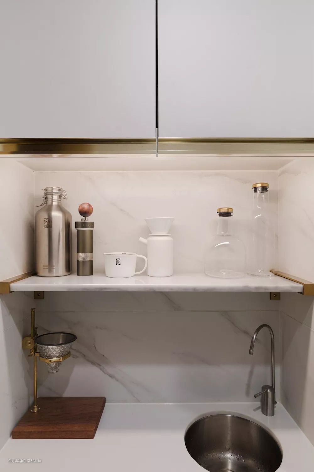 厨房进门的左侧有一个独立的小水槽,台面下面装净水机,拧开水龙头就是直饮水,台面上方的大理石搁板摆放水具,家里人一进厨房就能马上喝到水,非常方便。