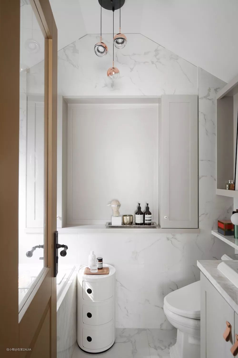 和次卫一样,天花板做了坡顶设计。正对门的墙角位置有下水管道,不美观,所以通过做壁龛把管道包了起来。壁龛两边的空间还做了封闭的收纳柜。