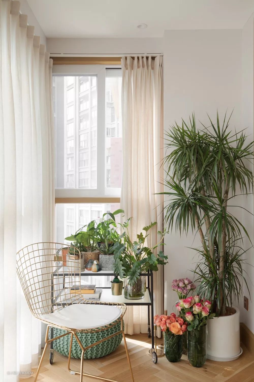 客厅再往前就是休闲阳台,这是一家人享受阳光的地方,我在这安排了一个养植物的小角落。