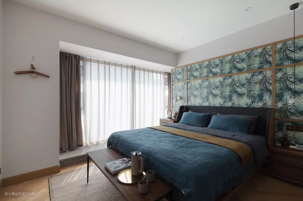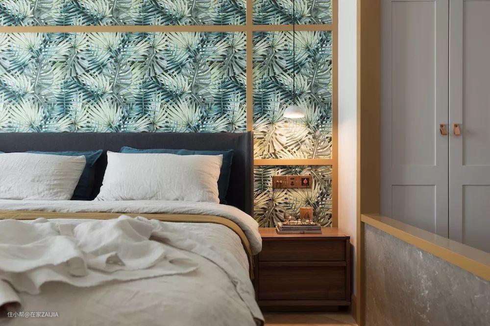 走廊尽头就是主卧,主卧延续了自然、宁静的氛围。床后的隔断使用的是木框架内贴植物图案的墙纸。