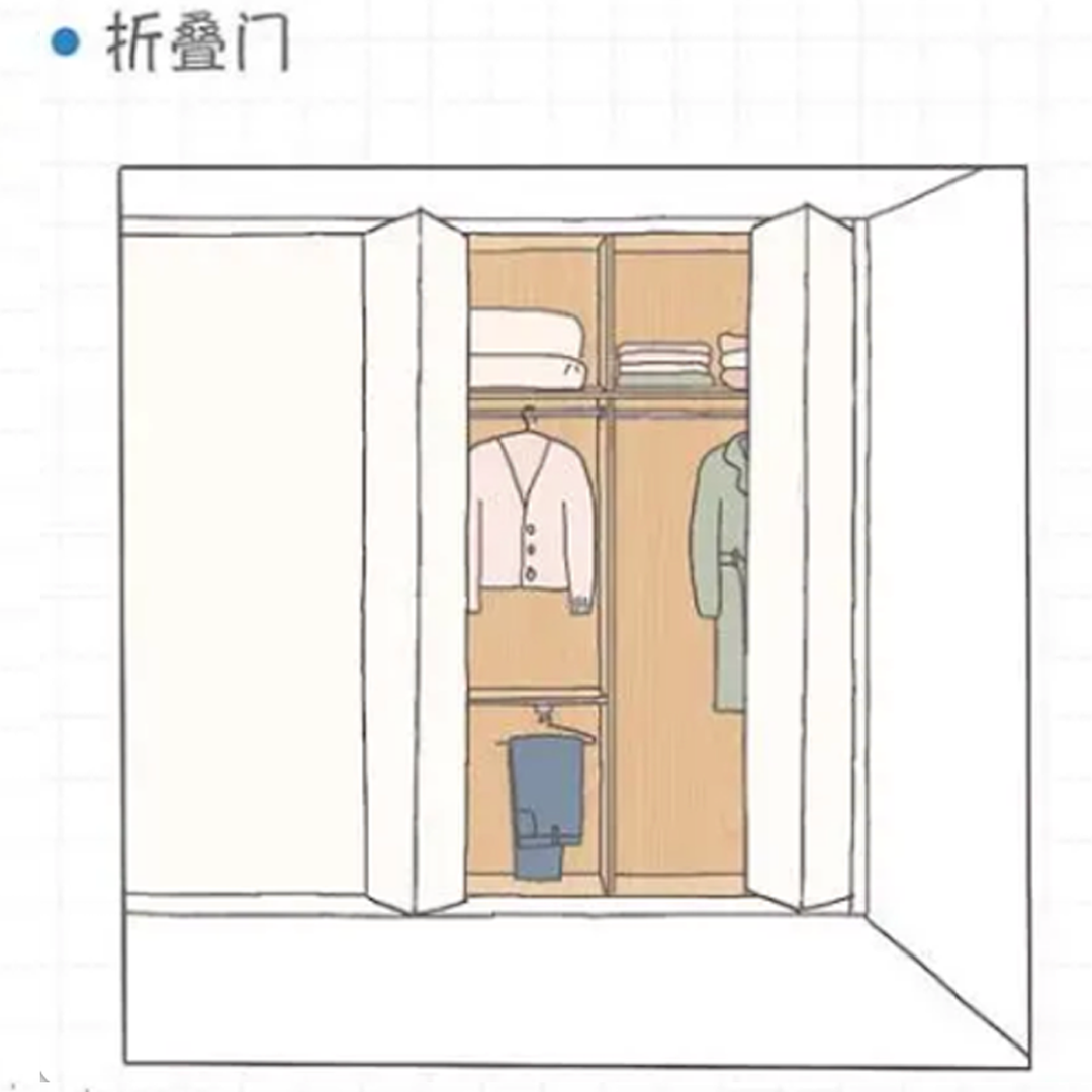 ▽ 更个性-折叠门:如果喜欢这种新颖的造型、一推到底的观感,可以考虑做折叠门。但工艺复杂且对五金要求高,如果质量不过硬,柜门就很容易损坏。
