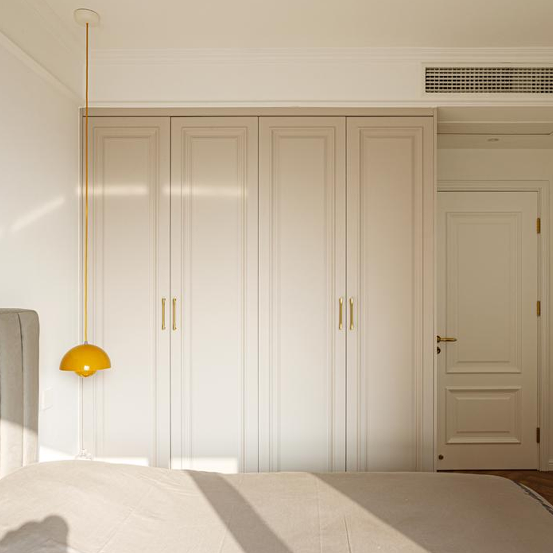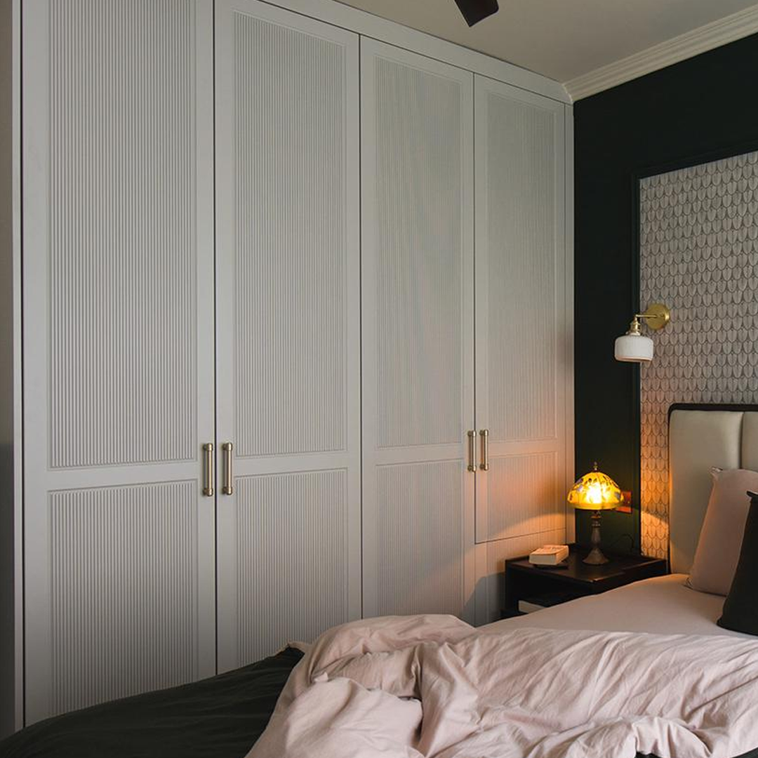 ▽ 复古风:多以奶油白、杏子灰色为主,做出回形门、格栅纹理增加层次感,加上别致的金属拉手更添韵味。