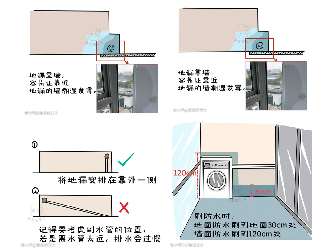 - 地漏装在靠窗侧,但不能距离管道过远,排水快。