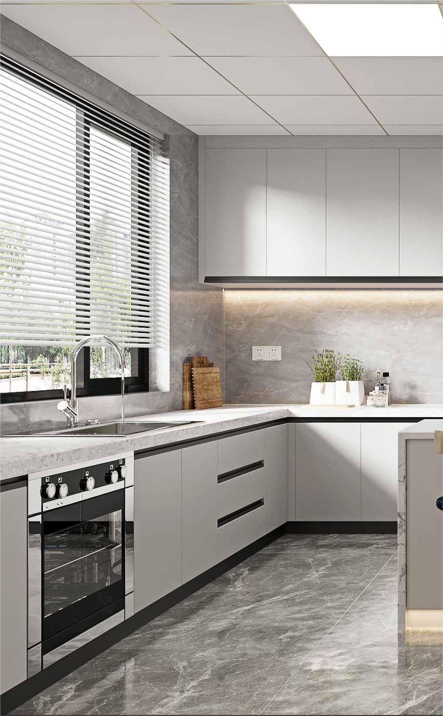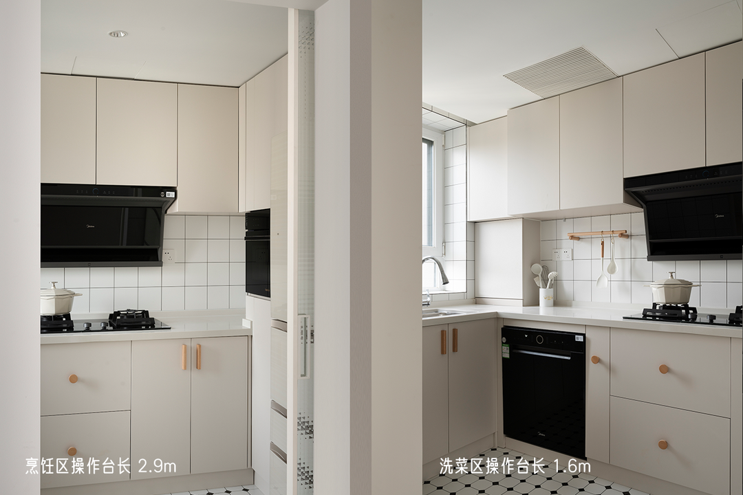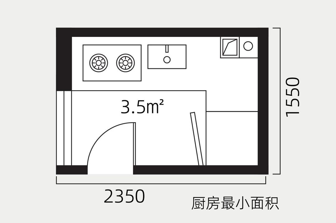 厨房电器多,是家中主要的功能间,使用面积根据住宅面积来定: 1. 最小面积:包含冰箱、燃气灶和水槽的厨房≥3.5㎡。 2. 套内90㎡以下:厨房使用面积宜在4~6㎡,操作台总长≥2.4m,面宽宜在1.5~2.2m。 3. 套内90~144㎡:厨房使用面积宜在6~8㎡,操作台总长≥2.7m,面宽宜在1.6~2.2m。 4. 套内144㎡以上:厨房使用面积宜在8~12㎡,操作台总长≥3m,面宽宜在1.8~2.6m。