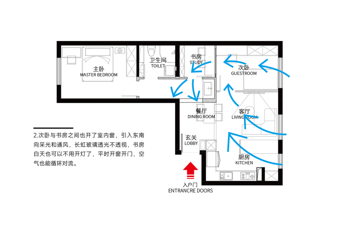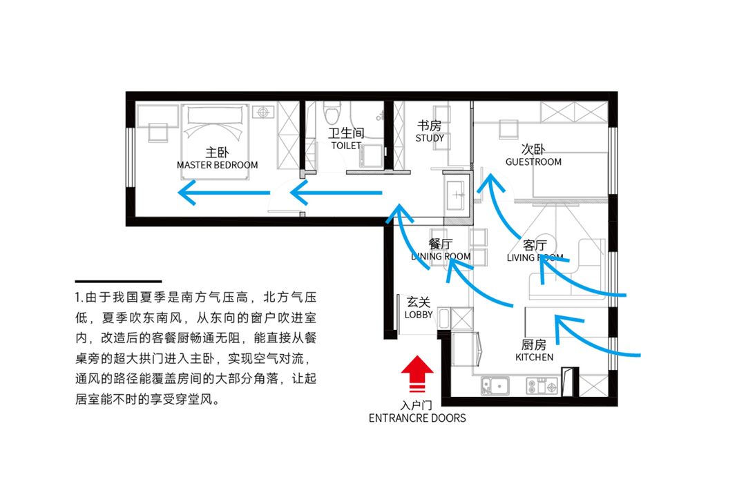 1. 南北向房间的窗户要相对,中间最好没有隔墙遮挡,能形成对流风。 2. 主要功能区如客厅、主卧应放在夏季迎风吹的一侧,厨房、卫生间、储藏间应放在背风处。 3. 北方冬天气温低,外窗时常关闭,可视情况加装新风换气。 4. 南方气候炎热,空气潮湿,尽可能扩大窗户面积,加强通风。 5. 寒冷地区入户位置不宜设在西北角,要避开冬季主导风向。 6. 炎热地区入户位置宜设在东南侧,利用夏季主导风向,让室内通风更顺畅。