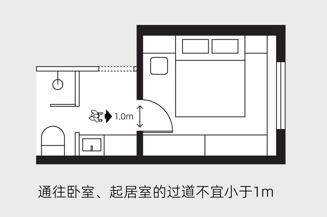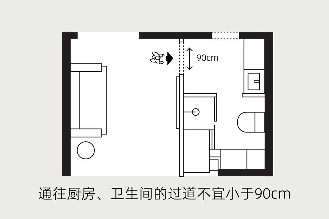 为方便通行,过道宽度有尺寸限制: 1. 入户过道不宜小于1.2m。 2. 通往卧室、起居室的过道不宜小于1m。 3. 通往厨房、卫生间的过道不宜小于90cm。