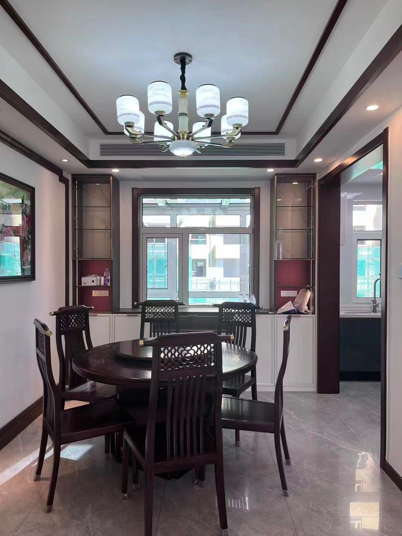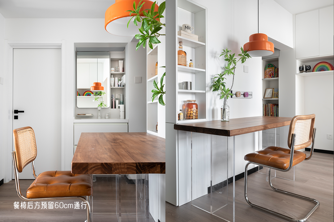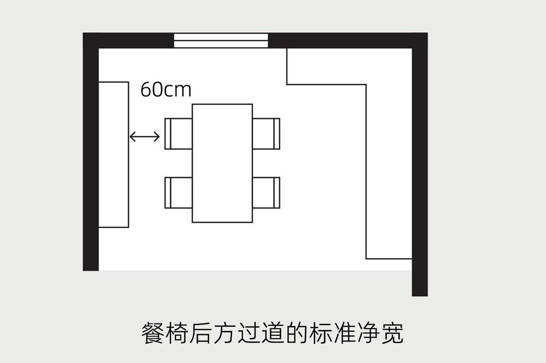 用餐区的使用面积要根据家庭成员数量来定: 1. 五口及五口以下的家庭:使用面积≥10㎡,面宽≥2.7m。 2. 六口到八口之家:使用面积≥12㎡,面宽≥3m。 3. 餐椅后方预留的过道标准宽度是60cm。