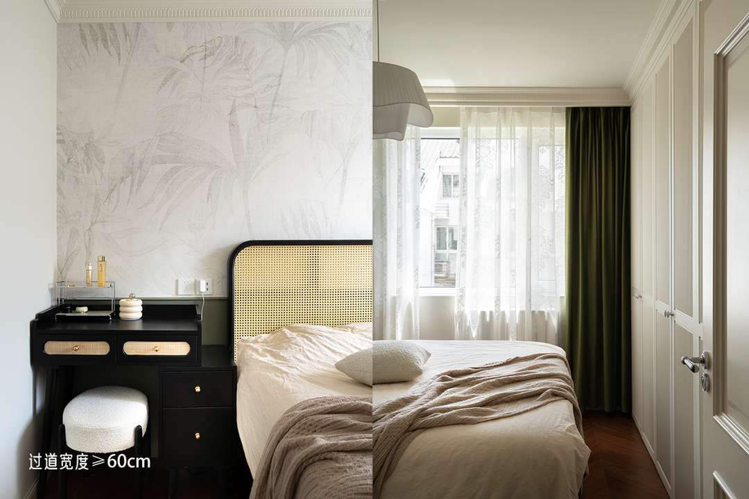 卧室面积主要考虑床和衣柜的尺寸,双人使用和单人使用的尺寸各有不同: 1. 最小面积:单人卧室≥5㎡,双人卧室≥9㎡,套间卧室≥12㎡。 2. 想使用舒适,单人卧室≥9㎡,面宽≥2.7m;双人卧室≥12㎡,面宽宜在3.1~3.8m,进深宜在3.8~4.5m。 3. 床尾或者床边过道的标准宽度是90cm,最小宽度是60cm。