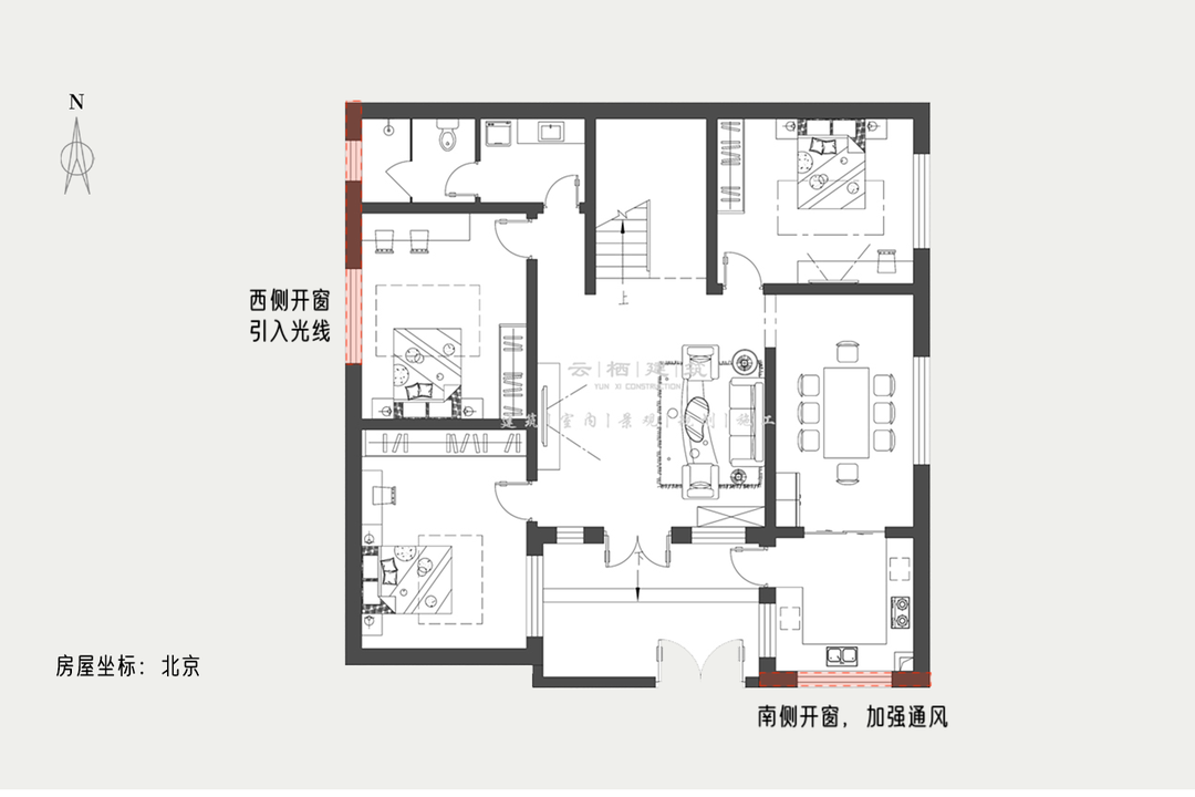 1. 房屋朝向:整体宜坐北朝南,将主要功能区如客厅、主卧、老人房放在南侧。 2. 房屋进深:北方离太阳直射点远,宜做进深小的房子;南方受太阳直射时间长,宜做进深大的房子。 3. 窗户位置:北方寒冷地区可以在西侧开窗,充分利用光照;南方西侧要避免开窗,防止光照过强影响居住。 4. 窗户大小:窗户越大采光越好,但也不能过大,在北方不利于保温,在南方则会引入更多光线,屋里更热。 5. 周边环境:南侧窗户周围不宜种植大型绿植,会遮挡阳光,西侧可利用绿植进行挡光。