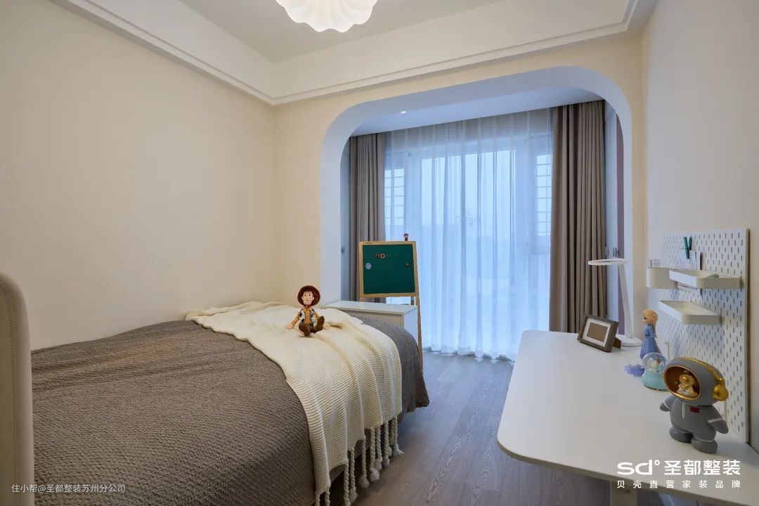 据大数据统计,从小在独立、安静的学习空间里学习的孩子,他的专注力普遍都比同龄人高。可以选择远离动区、采光优越的次卧做独立书房,并通过隔音门窗、吊顶设计来实现静谧环境。