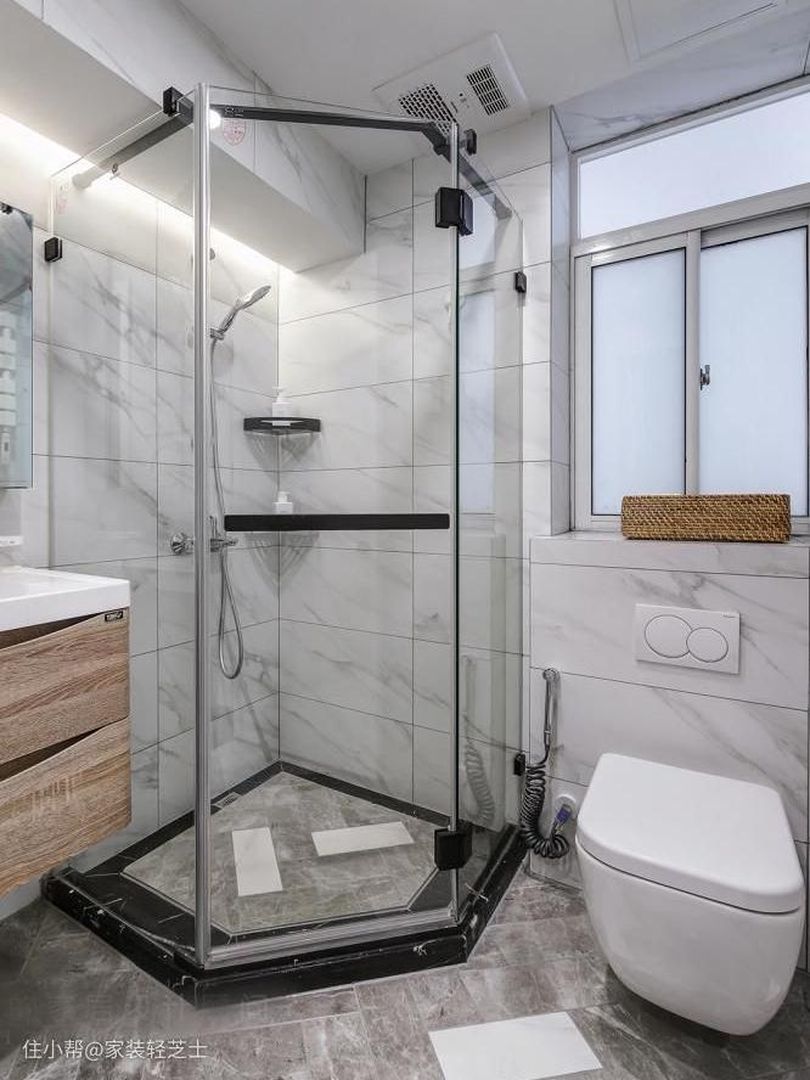 通常设置在卫生间角落,以两面墙为支撑,利用L型玻璃隔出一个方形淋浴区;内部空间充裕,不论是洗澡还是清洁都非常方便。