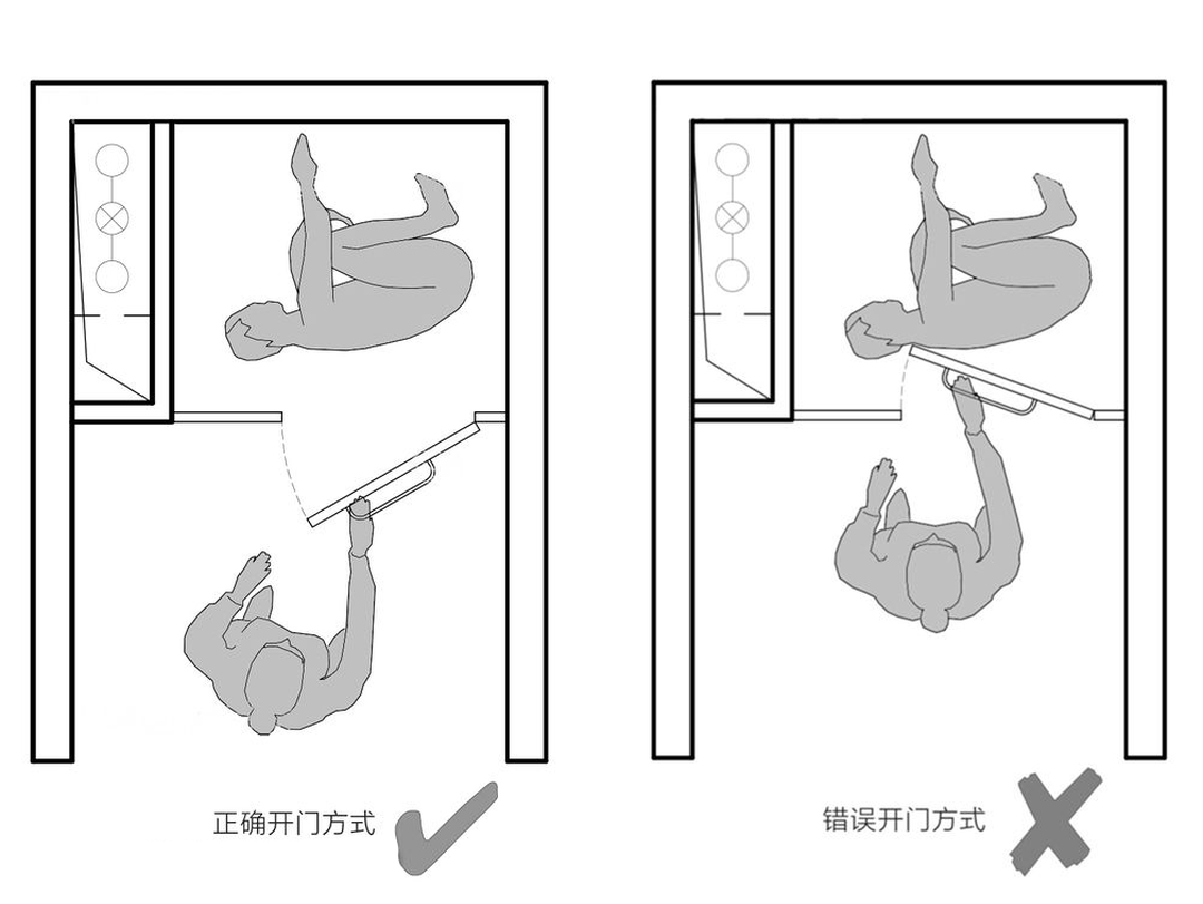 平开门又分为外开和内开,小卫生间常用内开,面积宽裕更建议外开门,避免人员在淋浴间内晕倒,而门被阻碍不能开启,无法实现快速救治。