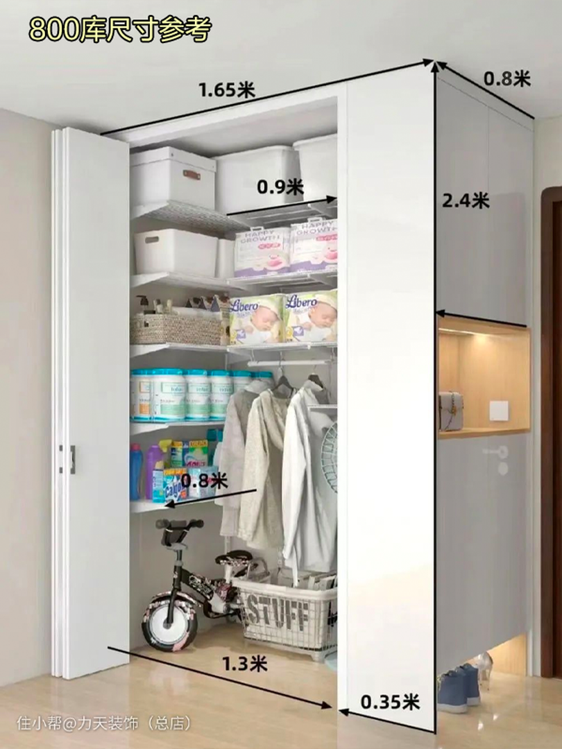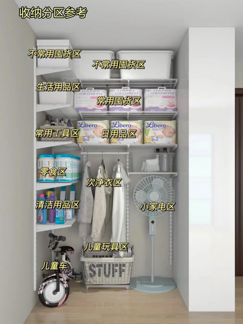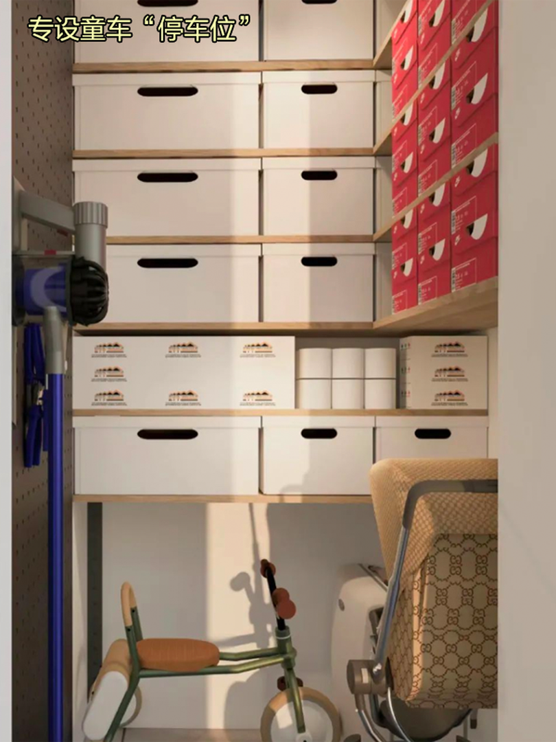 从孕期到孩子出生,物品量陡增,最好有个独立收纳区。婴儿车/脚踏车,最好停在靠近门的位置,不带入尘污,也不占日常使用空间。