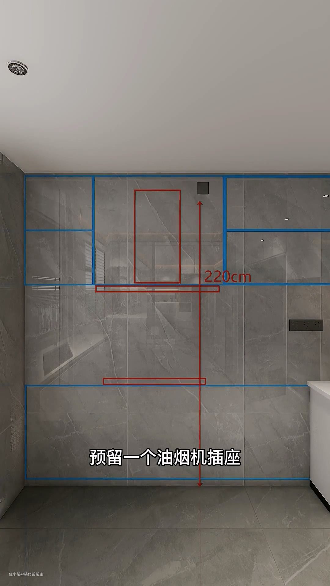 离地高度为220公分处,需要预留一个用于安装油烟机的插座,方便后续安装和使用。