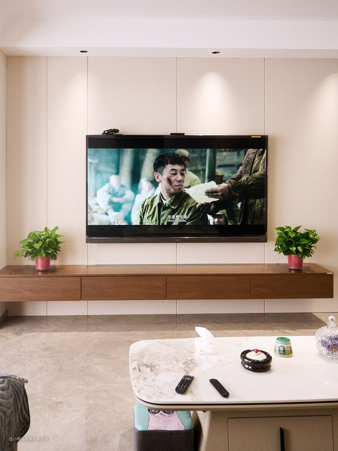 第二种是插座隐藏起来,还是传统的电视柜,以我家40公分高度电视柜举例,插座预留的高度在25到35分之间即可