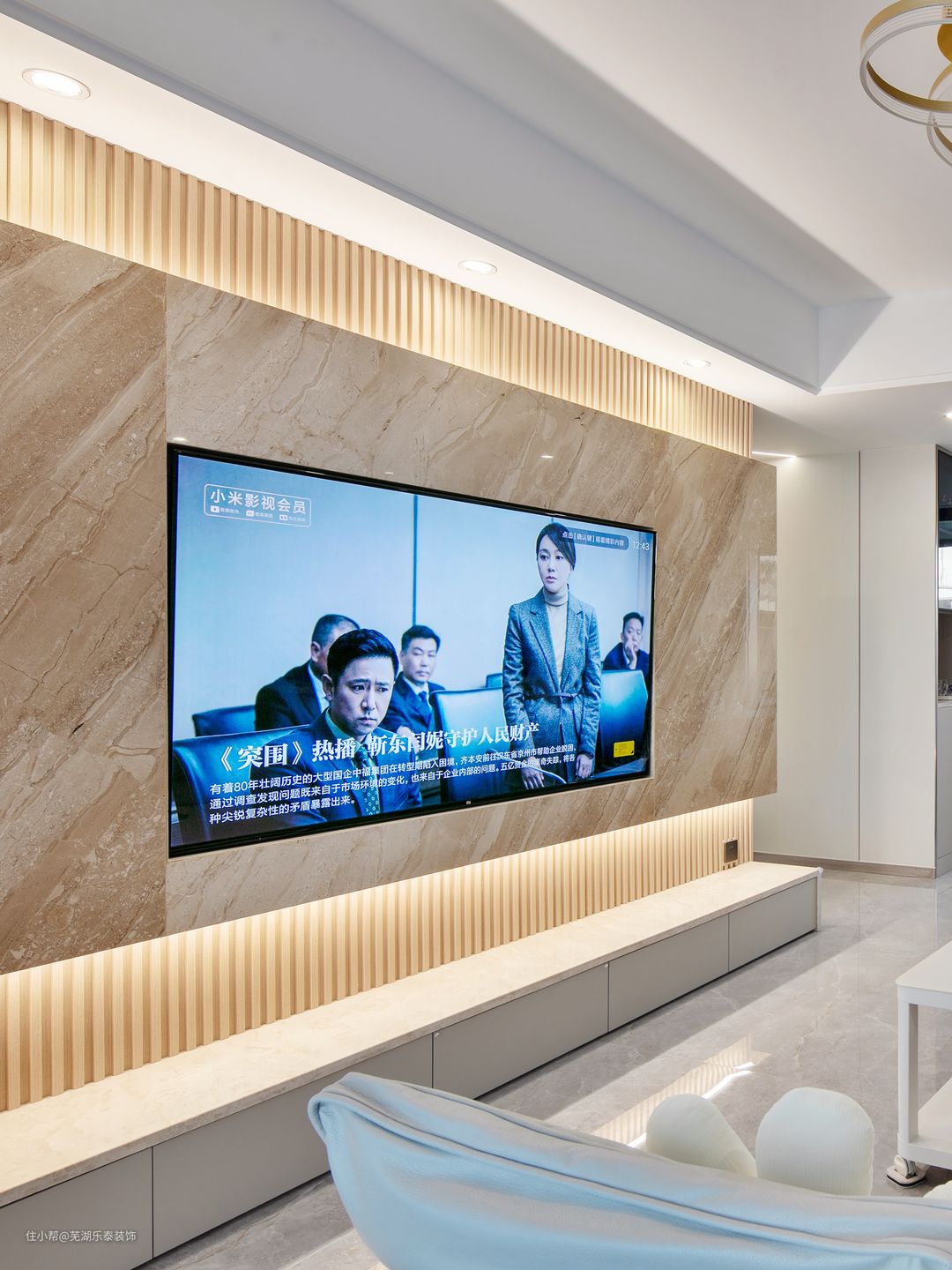 第一种情形是插座放在电视柜上方,传统的电视柜高度一般是在38到45公分左右,加上铺贴地砖的厚度在五公分左右,插座预留高度距离原始地面需要在50到55公分左右即可,这种插座的布局优点是后期使用起来比较方便,缺点就是线路看得到,美观性要差一点