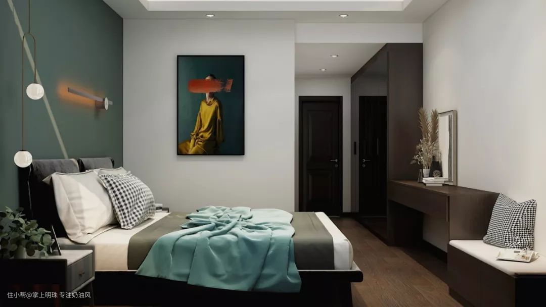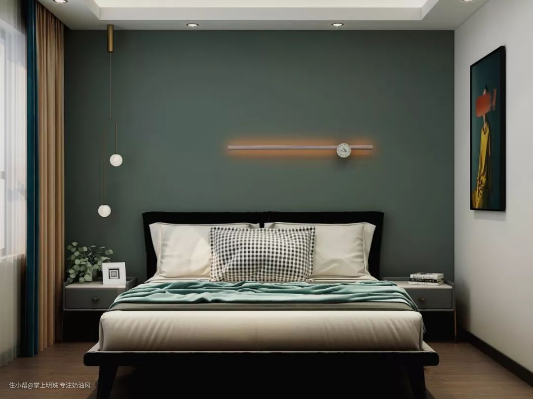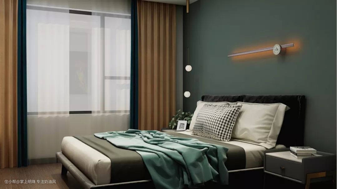 背景深色,家具和配饰就要选择中性色来调和。窗帘和墙面颜对比呼应。给空间增添光泽感,除了运用金属色,还可以在材质上有些变化,比如质感轻薄的玻璃灯。