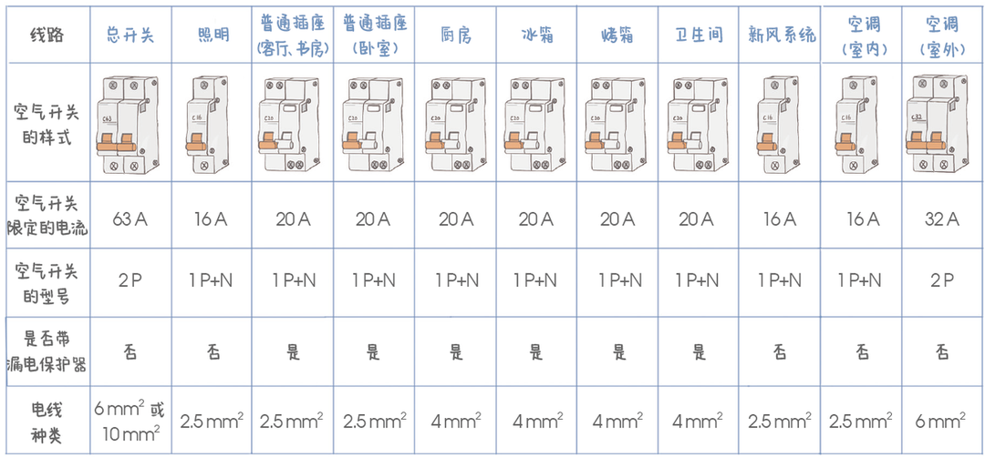 另外,家装里常见几种电线所对应的安全承载功率,以及配用的电闸空开也整理分享给大家: