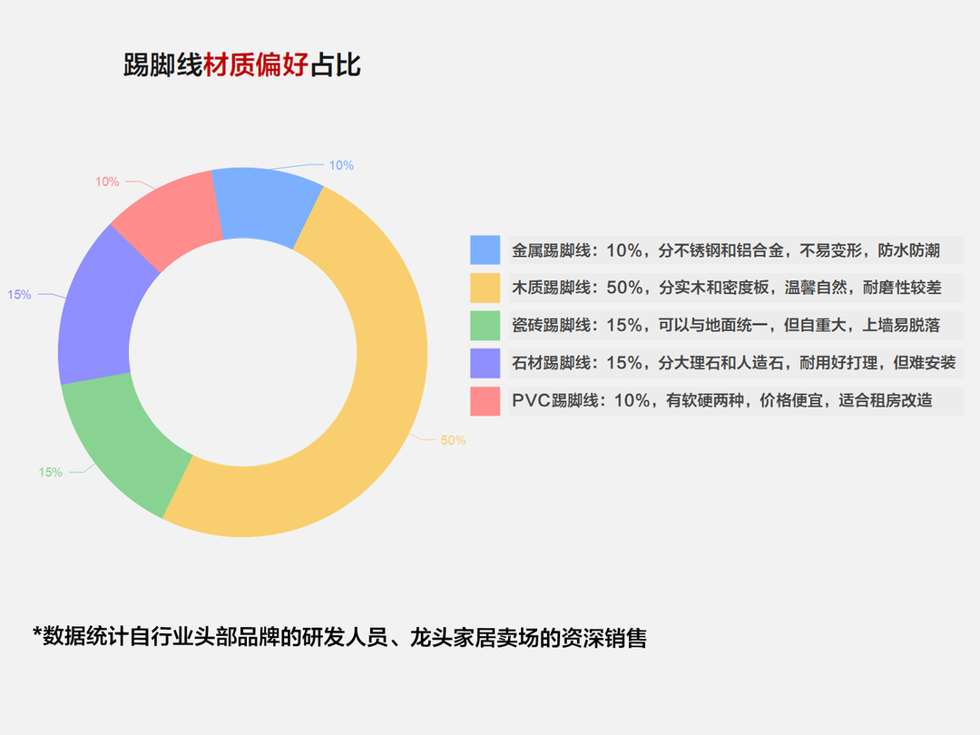 主流选择:金属和石材踢脚线更耐用;预算有限,优先选择瓷砖和PVC踢脚线。