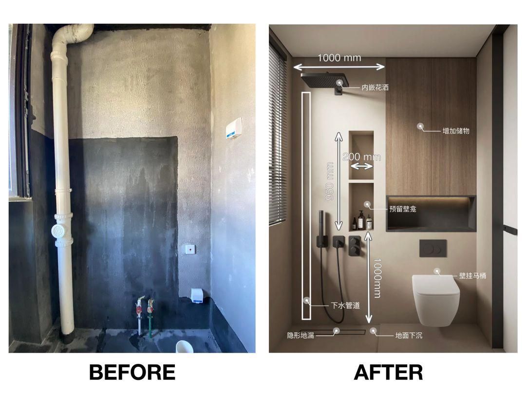 - 壁挂式马桶:墙排马桶需要加建一部分墙体来进行预埋,借助新建墙体设计壁龛,存放洗浴用品,也是较实用的设计方式(例如壁挂马桶上方&内嵌花洒旁边)。