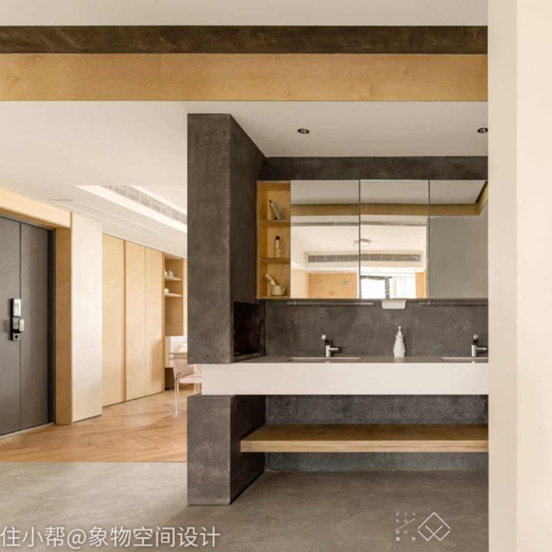1.将使用频率高的洗手台移到卫生间外,洗手同时家人也能使用卫生间。 2.洗手台外移动让空间更通透,房间有更多的自然采光,也更省电。 3.洗手台与卫生间的隔断可以做壁龛或定制柜,给收纳扩容。
