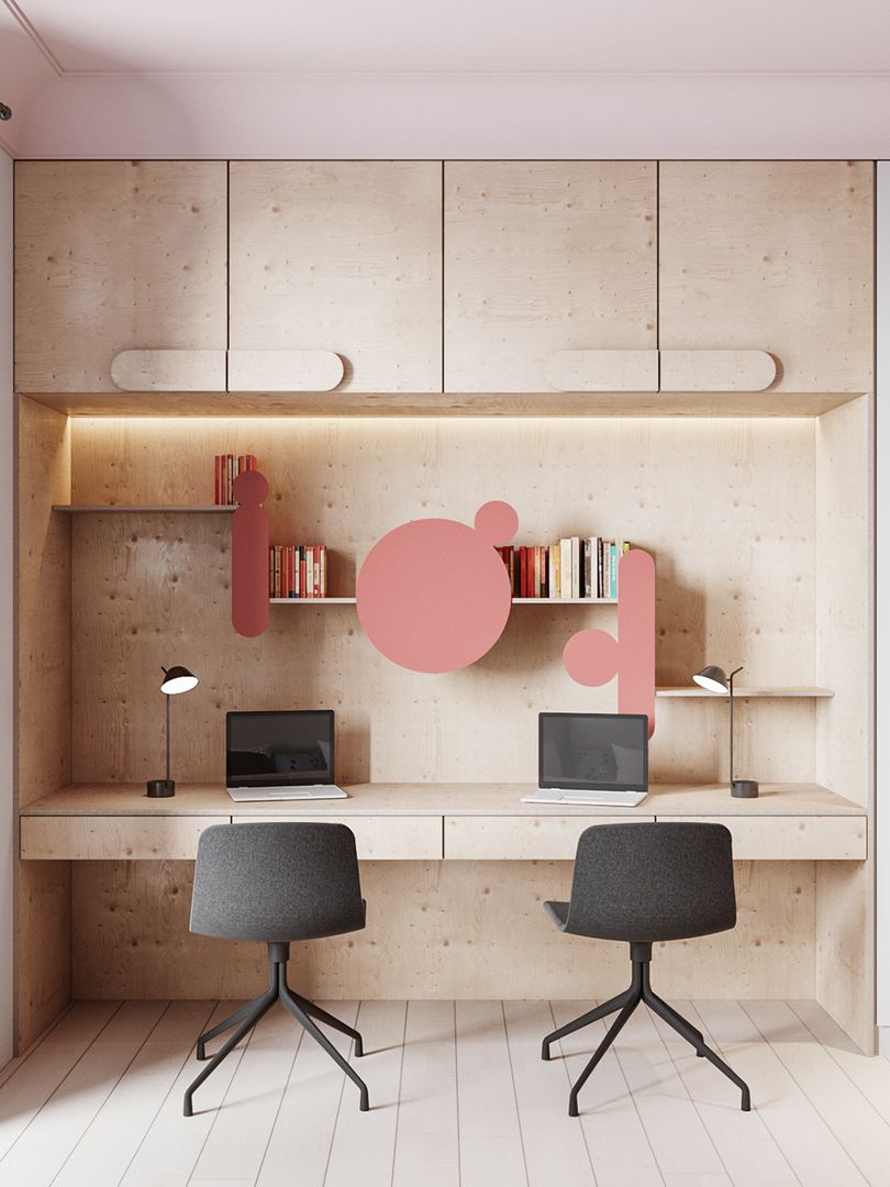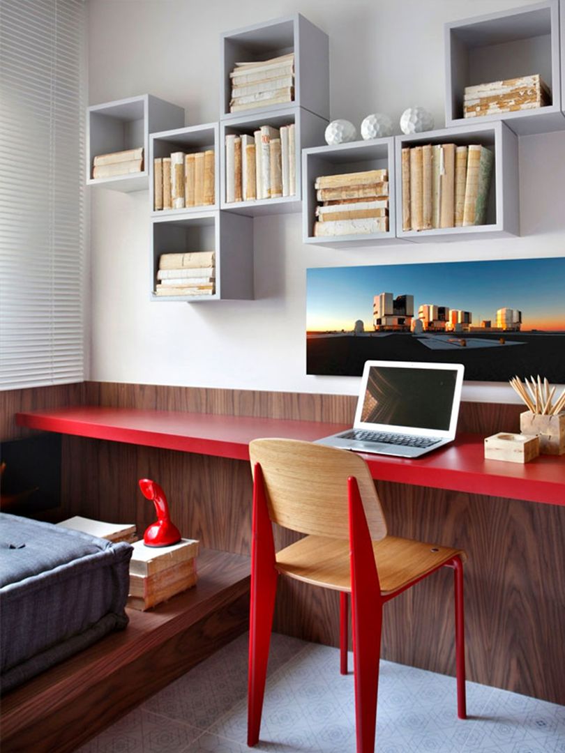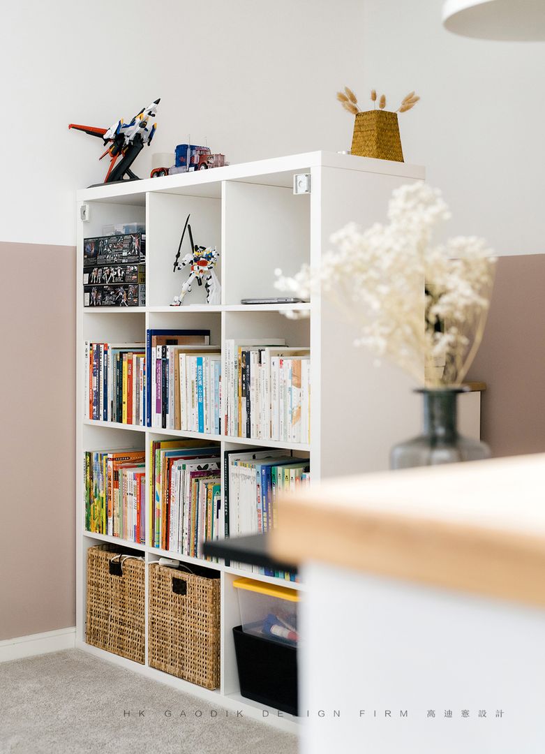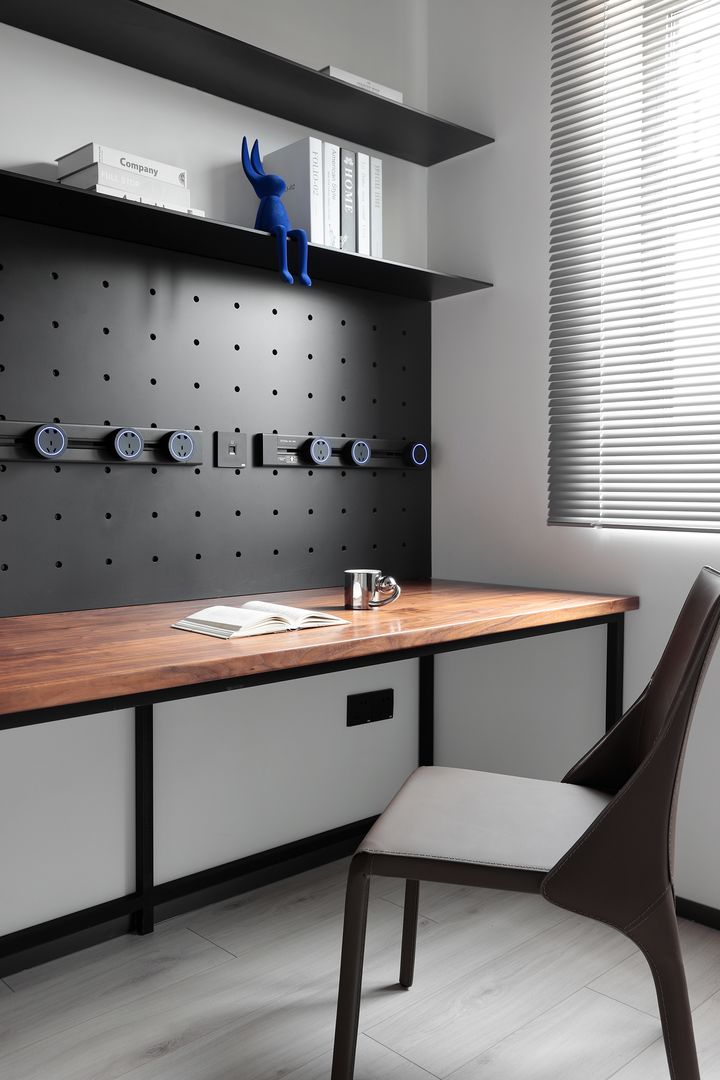 书房由于桌面用品和小物件较多,墙面收纳是空间的重要组成部分,也起到了一定装饰效果。