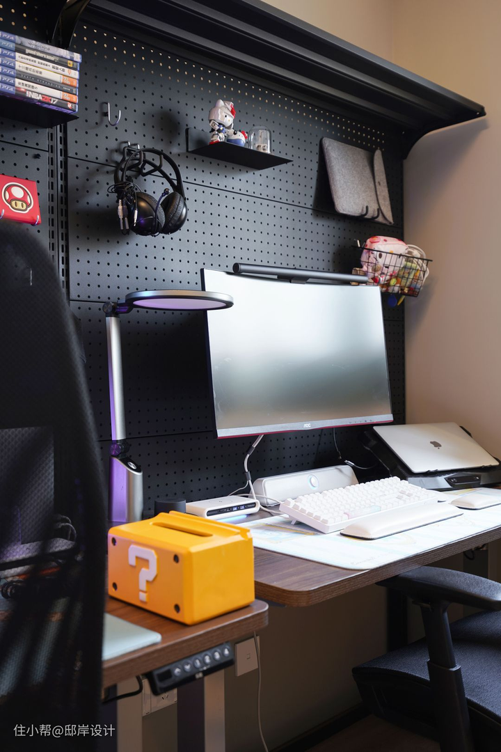 - 洞洞板承重有限可以与吊柜、隔板组合,打造展示与实用兼顾的桌前收纳墙。