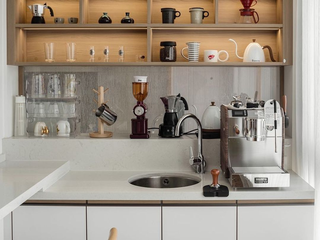 水吧区常见于开放式的中西厨,或者厨房外面、客厅走道、卧室走道等。