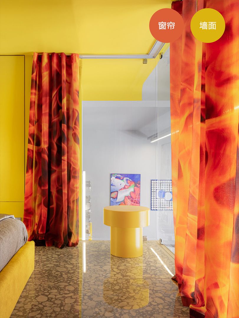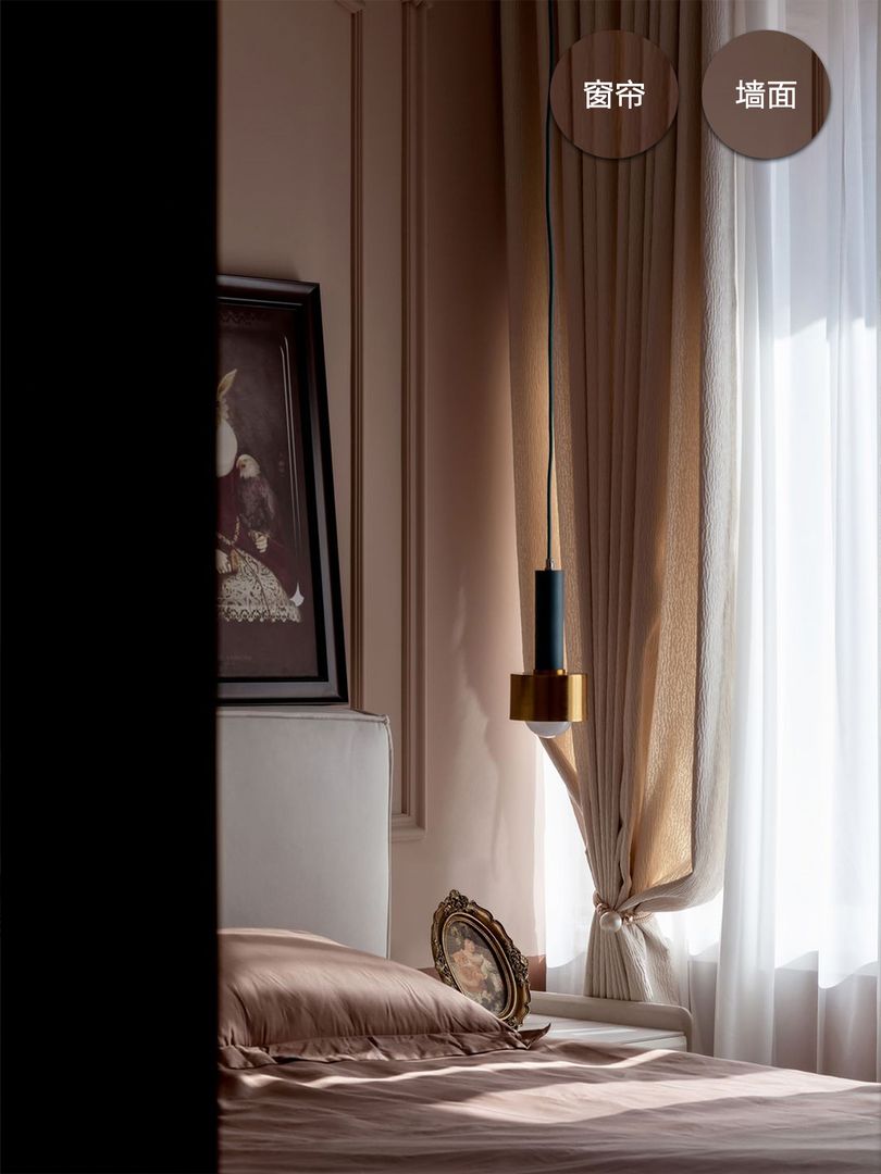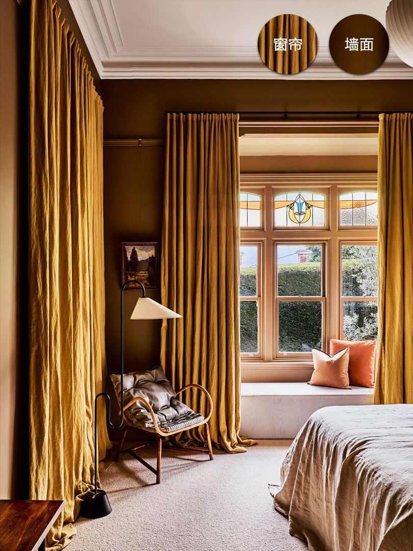 - 窗帘与家具同色/邻近,与沙发、床同色;或者窗帘和单椅小范围撞色,对比不会太强烈。