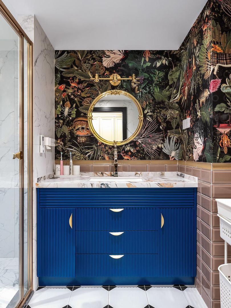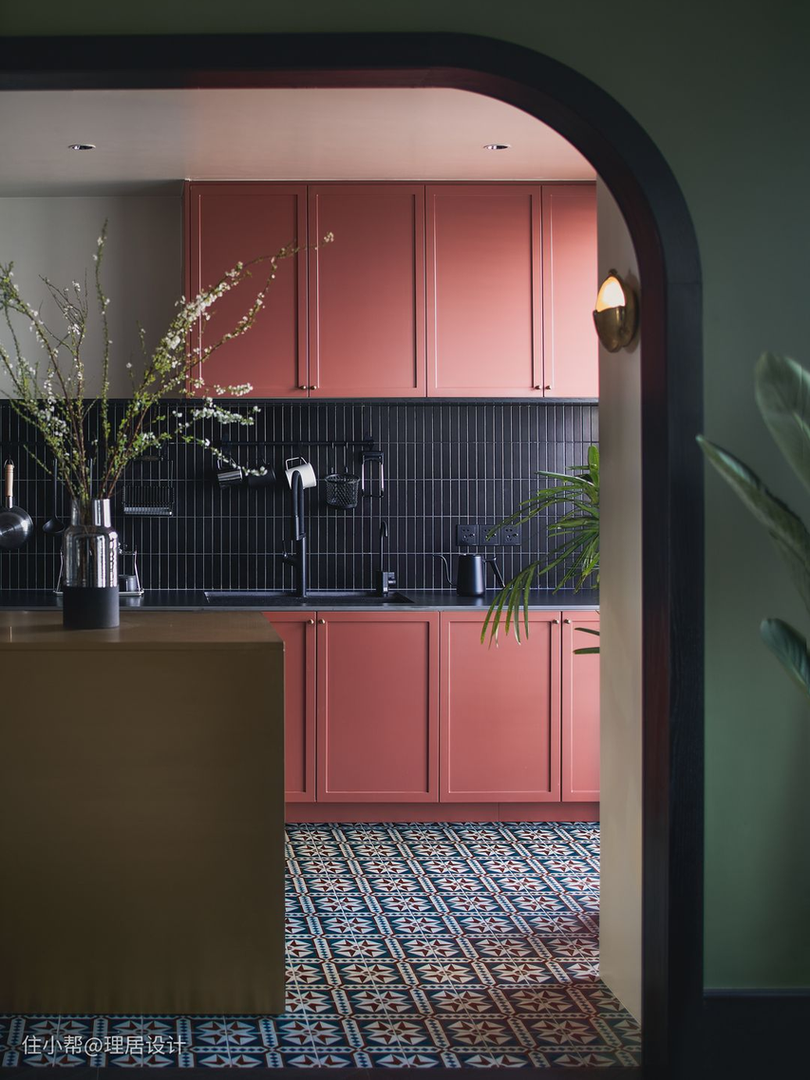 - 如果橱柜是复古彩色,墙砖选择黑色或者花纹砖来调和,卫生间区域可设计半墙拼接。