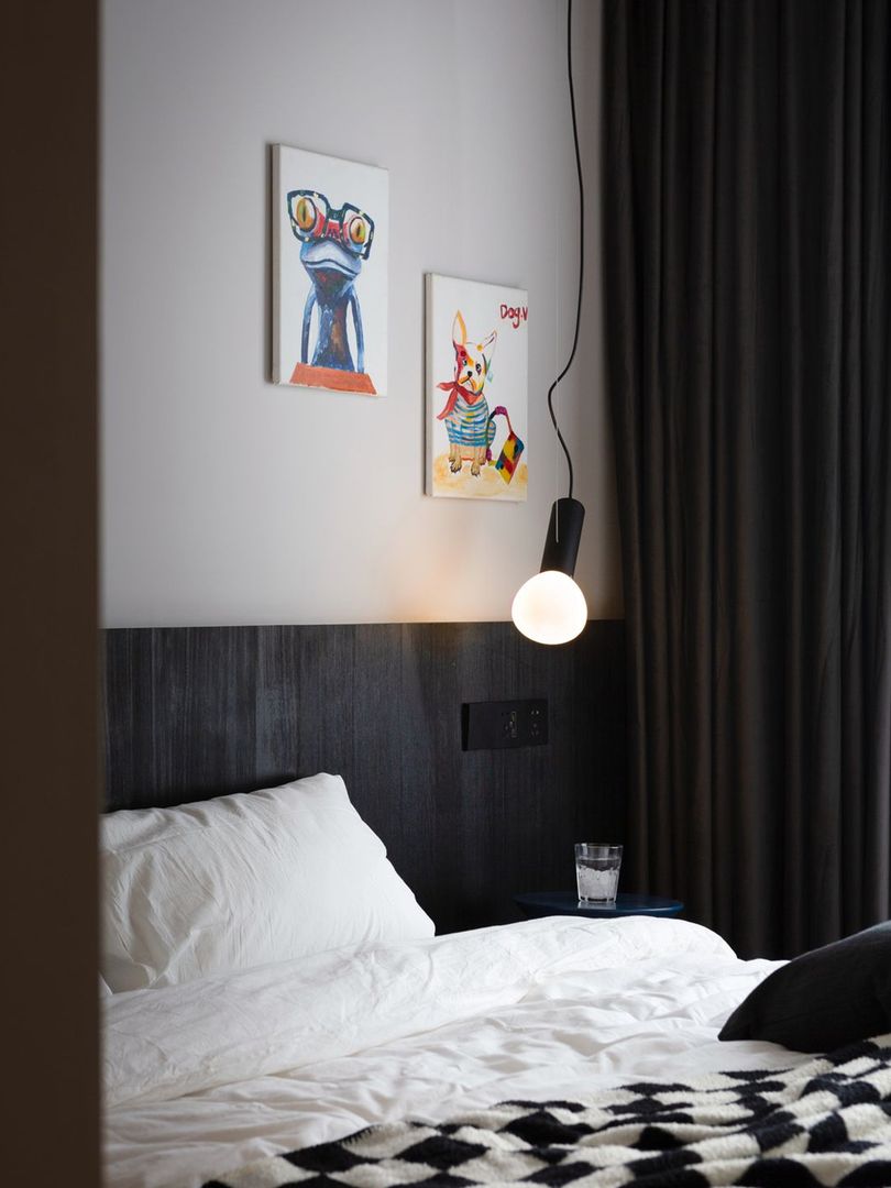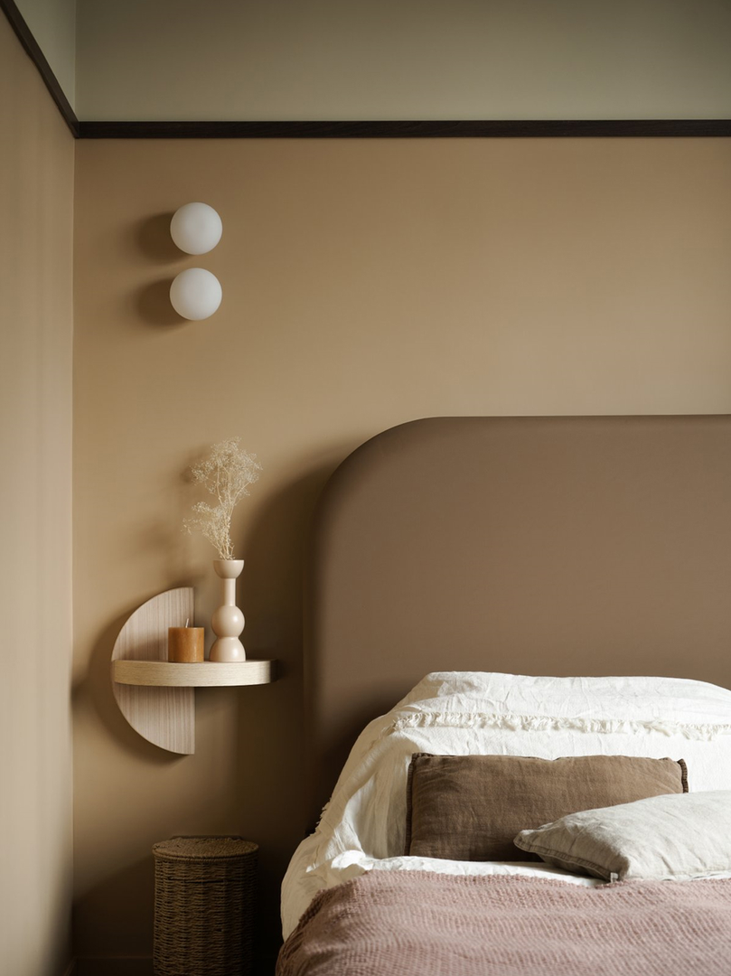 - 乳胶漆墙面与壁纸、床屏、木门撞色组合,打造更立体的空间。