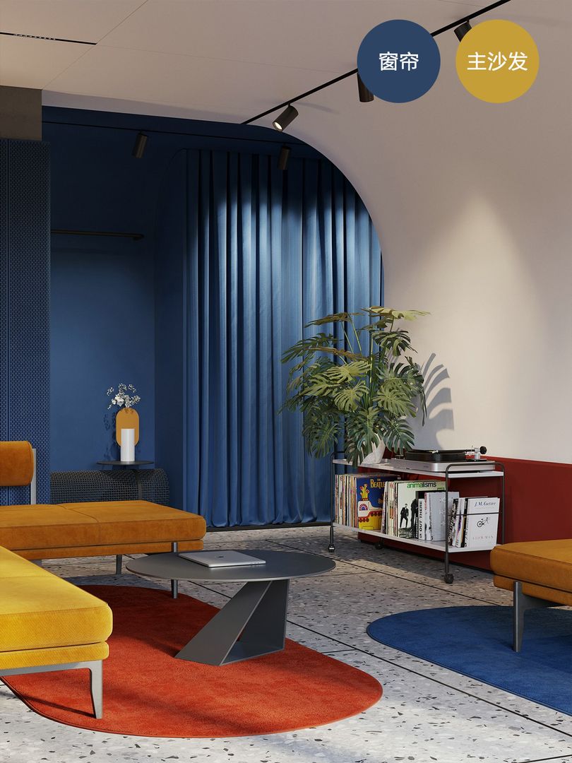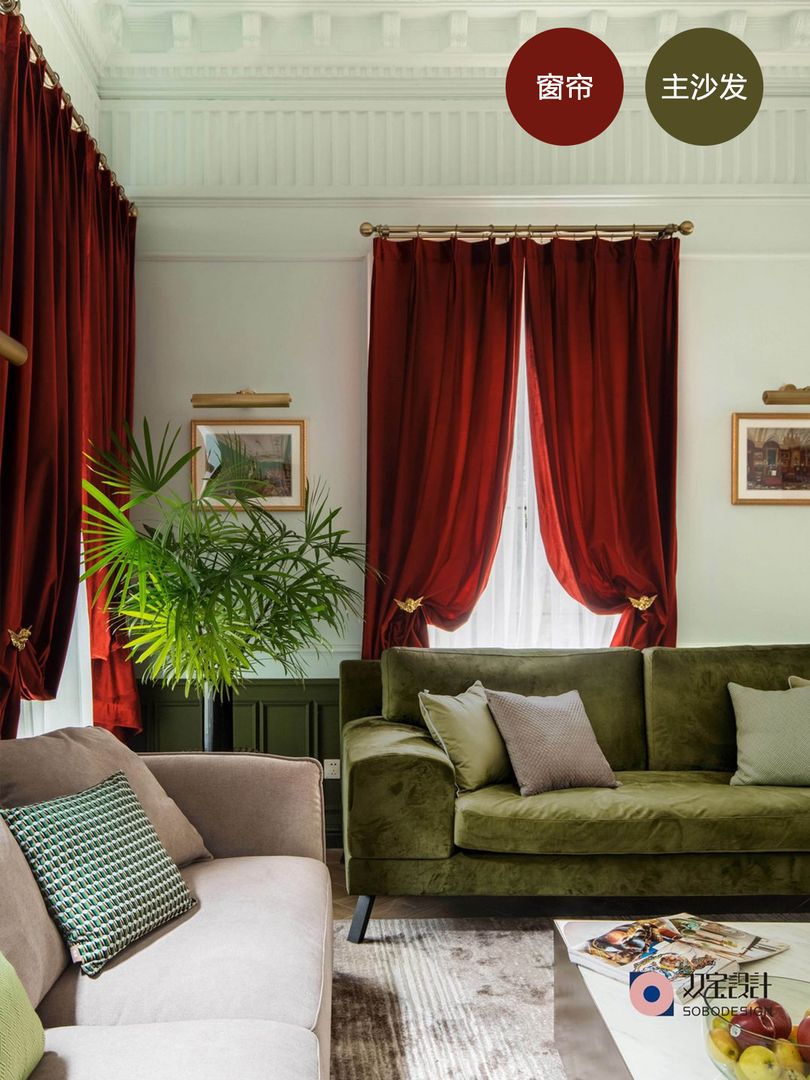- 窗帘与家具撞色,比如红色窗帘+绿色沙发,让空间更亮眼;注意增加辅助色来平衡,比如抱枕和地毯等。