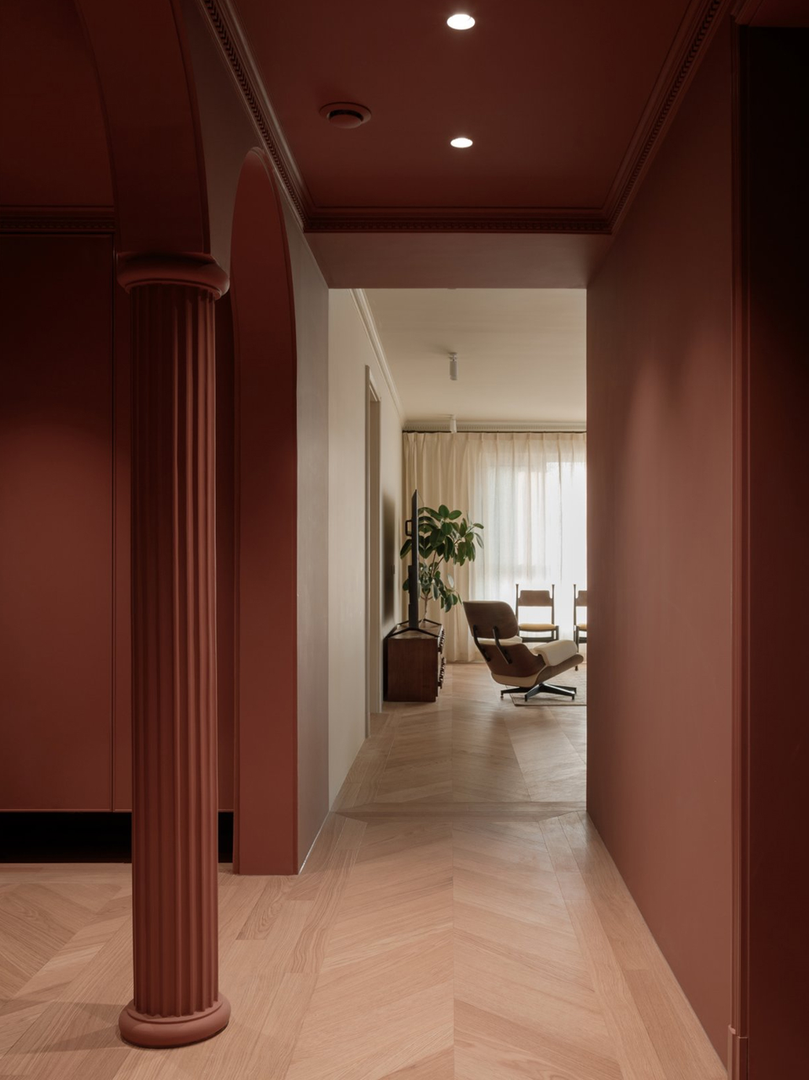 - 红棕色就是常说的“猪肝色”,适合极繁主义复古风;墙顶任何颜色,红棕色地面都能hold住,搭配偏黄/红色/黑色原木家具。