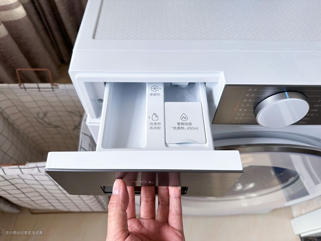 另外,超级筒洗衣机T7H还配置了智能投放系统,可以智能感知衣物重量并投放匹配用量的洗涤剂。智能投放舱一次可添加450ml洗衣液,不仅使用省心,还可精准控制洗涤剂的投放量,在高效洗衣的同时有效减少洗涤剂残留,对于家务小白来说也是相当友好。