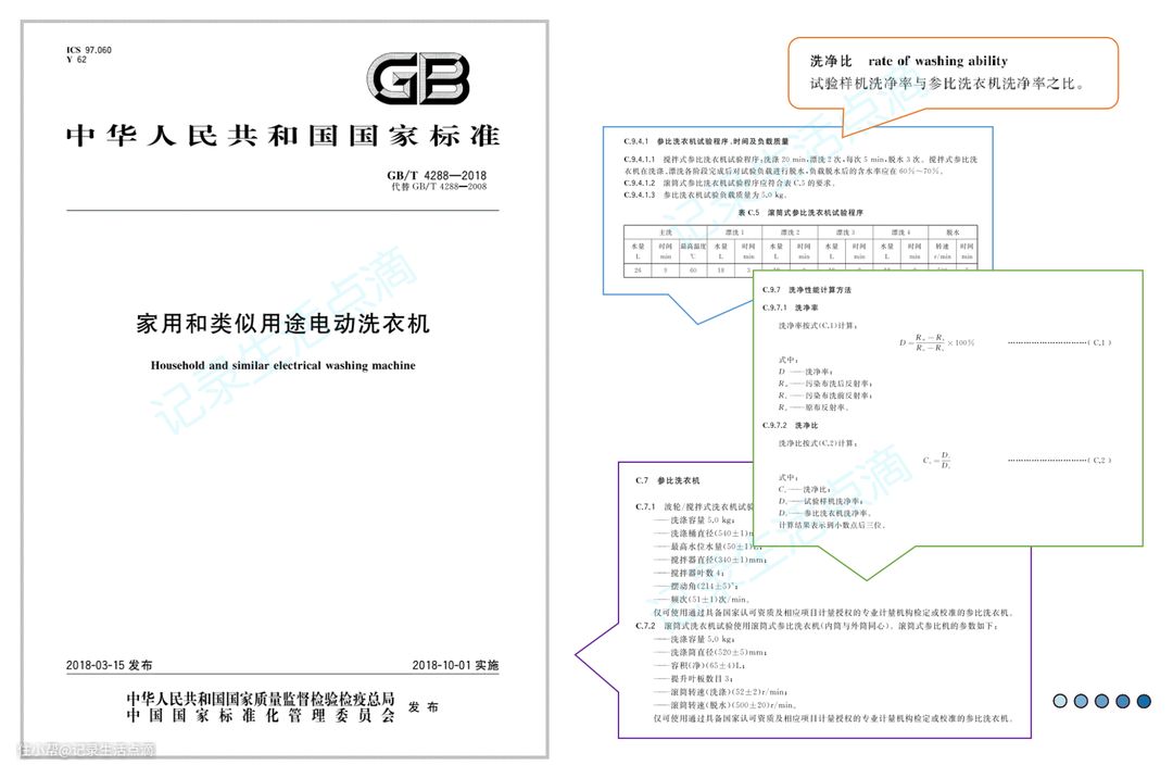 有小伙伴可能会质疑这个参数,单单一个数值就能代表洗衣机的洗净能力?但事实确实如此,在GB/T 4288-2018《家用和类似用途电动洗衣机》中对于洗净比的测试、计算方法等都有详细的介绍,洗净比就是试验样机洗净率与参比洗衣机洗净率之比,它可以全面衡量洗衣机的洗净能力。选购洗衣机时,关注洗净比这一参数是最简单也是最明智之举。