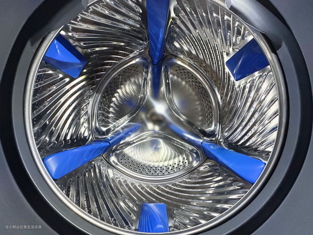 筒径大不仅仅只是洗烘容量更大,它还能更彻底地洗净衣物,因为滚筒洗衣机是通过滚筒转动带动水流冲击摔打衣物来实现污渍分离的,那么筒径越大摔打就会越充分,衣物自然也洗得更干净了。