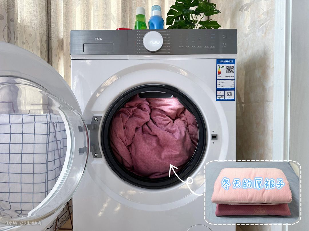 为了验证拥有540mm筒径的超级筒到底有多能装,我用一条冬天的厚被子作为测试,想不到竟然也能全部塞进去,太让我震惊了。不得不说,家里有一台超大洗烘容量的洗衣机真的太方便了,上周末一次性就把家里的所有窗帘洗烘干净了,换作以前至少得分2~3次洗烘。