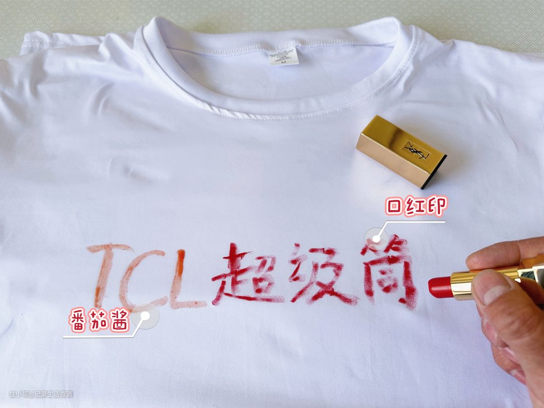 继续加大测试难度,在白T恤上用番茄酱和口红写了几个字,尤其是口红污渍,遇到过的小伙伴肯定知道这种妆渍特别不好洗,我家之前那台旧洗衣机就洗不干净,即使在机洗前手动搓洗过,洗完还是会残留淡淡的痕迹,下面就来看看这台1.2超高洗净比的洗衣机实力到底如何。