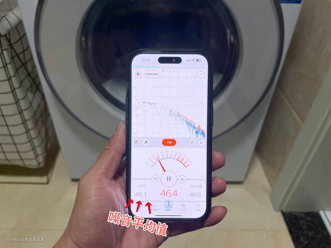 实测下洗衣机工作时的噪音,洗涤时实测噪音平均值为46.1dB(A),噪音确实控制得很不错,即使夜间使用也不会影响到家人。我家洗衣机是放在阳台的,和书房仅一道玻璃移门之隔,在房间里基本听不到洗衣机的声音。