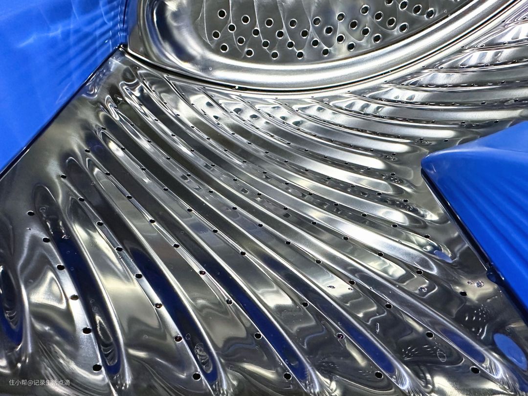超级筒的内筒壁也有些与众不同,它采用了海波纹设计,而不是像传统洗衣机内筒壁上只有简单的圆形凸点。海波纹筒壁的优势在于滚筒转动时水流会在衣物和内筒壁之间形成一道水膜层,可以大大减少衣物和筒壁间的摩擦,从而达到更好的护衣效果。毕竟这年头很多衣服都是洗坏的,而不是穿坏的,所以一台洗衣机在护衣方面的表现也十分重要。